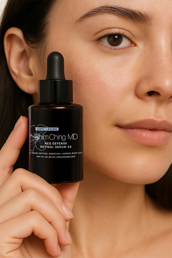 Using your fingertips, gently apply a thin, even layer of the Shim Ching MD Age Defense Retinol Serum 5x to the face, focusing on areas of concern such as discoloration, fine lines, wrinkles, uneven tone, or blemishes. The quick-absorbing formula penetrates gradually, allowing the Retinoin™ Active Pro-Penetrant system to deliver a perfected dose of All-Trans-Retinol and Bakuchiol for optimal results. A mild tingling may occur, which indicates active retinization is taking place.